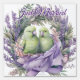 Lavender Lovebirds - this is a charming watercolor art piece designed with two lovely lovebirds in soothing green hues surrounded by a wreath made from charming lavender florals. The soothing hues of lavender and greens are a great addition to any home decorating style and add a calming feeling to your surroundings.