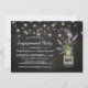 Country chic engagement party invitations featuring a rustic black chalkboard background, string lights, a mason jar with purple lavender flowers, wrapped in burlap with the couples initials and a party template that is easy to personalize.