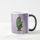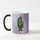 This mug features a cartoon illustration of a smiling cucumber character playing a golden saxophone on a metallic brushed metallic purple gradient background. The cucumber has green coloring and large cartoon eyes with black pupils and white sclera. The cucumber character has small green feet and is drawn in a cute, anthropomorphic style. The saxophone is positioned at a slight angle, with the cucumber's hands gripping it. The background has a brushed metal texture with a purple-lavender color scheme. The cucumber musician image is on both sides of the mug. The mug is a Morphing Mug. When you add a hot drink to the mug the image is visible. The mug shown is an eleven ounce mug.