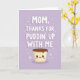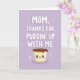 This card features a calm lavender background that sets a gentle, cozy mood for Mother’s Day ❤️. Centered near the top is a large line of white text that reads “MOM, THANKS FOR PUDDIN' UP WITH ME,” using rounded letters with a faint shadow for a soft lift. The wording feels affectionate through its sweet joke, like a warm hug tucked into a pun. Along the bottom sits a cute dessert cup character in creamy beige, topped with a wavy dark-brown layer that looks rich and comforting. Its big black oval eyes and rosy pink cheeks give it a tender, thankful look, as if it’s gazing up at mom with shy affection 👩. Small white sparkles and snowflake-like shapes are scattered around the text and character, adding a light, twinkly touch without crowding the scene. The dessert cup is positioned at the lower center, with the dark topping forming a smooth wave and the tiny white accents floating above it against the lavender field.