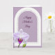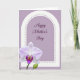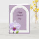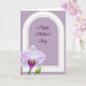 This design shows a soft lavender-and-white orchid resting in the lower left, its petals opening like a gentle embrace that suggests quiet closeness ❤️. Near it, a small green bud stands upright, adding a friendly, forward-looking touch as if it’s leaning in to keep the bloom company. A white arched border frames the scene, and along the inner edge runs a neat line of tiny lavender dots that echo the background. Inside the arch, the backdrop stays a steady pale lilac, calm and airy. The orchid’s center is richly colored with deep magenta and royal purple, with fine golden-yellow streaks that pull your gaze inward. Across the upper half, a celebratory message appears in deep violet, set in flowing calligraphic lettering and centered within the arch 🌼. The lighting is soft and even, showing gentle texture on the petals without sharp shadows. The white arch curves smoothly above the flower, while the dotted trim forms an even halo around the lilac field.
