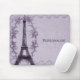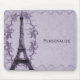 Add an elegant touch to your home office or workspace with this contemporary mousepad design featuring the Eiffel Tower against a grunge swirl and postage stamp background in lavender purple. Customizable text allows you to alter fonts, change text colors and sizes as you wish. Personalize for yourself or makes a great gift.