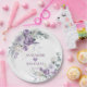 This elegant paper plate is a charming addition to any wedding celebration, blending practicality with personalized beauty. Adorned with soft purple and white florals and lush green leaves, it frames the couple’s names and their special date in a romantic, heart-centered design. Ideal for bridal showers, rehearsal dinners, or reception dessert tables, it adds a thoughtful, coordinated touch to the event décor. Guests will appreciate the sentiment and style, while hosts enjoy the convenience of a disposable piece that still feels custom and celebratory.