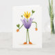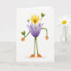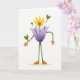 This design shows an anthropomorphic flower character standing in the center of a bright white background, painted with soft, brushed textures that feel gentle and friendly ❤️. Wide lavender petals form its body, while a sunny yellow bloom sits on top like a head, giving it a sweet, attentive presence. Small deep-blue dot details near the middle suggest eyes, as if it’s holding a tender gaze meant for a close friend. Thin green stems act as arms, ending in small orange hands that reach outward in a welcoming, almost hug-ready gesture. Two longer green stems make the legs, with rounded orange feet resting on a faint beige ground line for a simple sense of place. Heart-shaped green leaves sprout from the head and shoulders, adding a romantic little flourish 🌼. Near the upper area, a short greeting appears in soft lavender lettering, centered above the character. The colors stay gentle and sunny, with lavender petals, a yellow blossom, green stems and leaves, orange hands and feet, and tiny deep-blue dots against the white space.