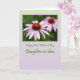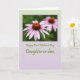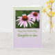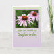 This card features a close-up photo inset of a daisy-like flower, shown in crisp detail as if you’re leaning in to admire it together ❤️. The petals are lavender-pink and fan outward with a gentle, affectionate softness, while the center is a textured orange-red disk packed with tiny florets that feel lively and inviting. Behind the bloom, deep emerald leaves blur into the background, and a faint second flower shape lingers like a quiet companion in the garden. A thin lilac-and-white frame outlines the photo area, separating it from the lower section without feeling harsh. Centered below the image, the line “Happy First Mother’s Day Daughter-in-law.” appears in olive green, written in a flowing, cursive-style font. The words sit comfortably against a soft gradient background that shifts from muted sage near the top to pale lavender at the bottom 🌼. The orange-red center of the flower stands out against the cool greens, with the lilac border echoing the lower lavender tones.