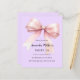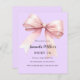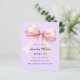 A soft lavender, purple colored background, decorated with a large pink bow. Personalize and add a name and party details. 1 sheet = 1 invitation printed edge to edge.
