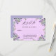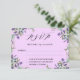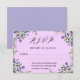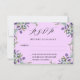 A RSVP card decorated with lavender flowers and greenery. Pink background. Personalize and add the reply by date.