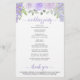 These wedding programs are elegant and tasteful, while still being budget friendly. The design features a bevy of hand painted watercolor roses and flowers in shades of dusty purple, lilac, and lavender surrounded by eucalyptus leaves and garden foliage. The typography features lacy script calligraphy, and there is room for details on the ceremony, the bridal party, and a short thank you.