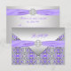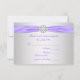 Elegant lavender purple ribbon with diamond jewel center over a silver lace and purple background wedding RSVP. Customize with your choice of font style and font color.
