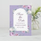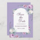 This lavender-purple wedding save-the-date card features white and purple watercolor peonies, lavender, geometric shapes, and typography. Ideal for an outdoor wedding. Find matching items in Lavender Purple Floral Wedding Collection. A printable file is available.