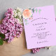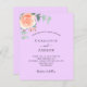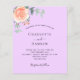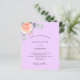 A violet, lavender colored background. Decorated with a rose gold and blush pink floral, rose flower and green watercolored eucalyptus leaves, sprigs, greenery and faux gold sprigs. Personalize and add your names and wedding details.