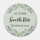 A Save the Date magnet for your wedding guests. A sage green colored background decorated with lavender flowers and eucalyptus greenery. Personalize and add your names and wedding date.
