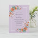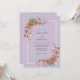 This design features a soft lavender background accented by vibrant terracotta wild roses and dusty teal foliage. Delicate white berry sprigs add a touch of whimsical detail to the floral arrangement. The contrasting palette of warm orange and cool purple creates a romantic and fresh atmosphere. The watercolor style lends an artistic and ethereal feel to the overall aesthetic.