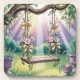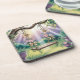 This coaster features an oak tree swing in a dreamy atmosphere. The photorealistic image shows a wooden tree swing adorned with shimmering metallic gold bows and metallic pastel pink and blue flowers. The swing gently hangs from a thick oak branch. Sunlight streams through the lush green foliage creating an ethereal glow, while the background softly fades into a metallic lavender hue, emphasizing the peaceful atmosphere. The garden contains ceramic planters with delicate ferns. The coaster is a square hard plastic coaster with a cork backing. The coaster set contains six plastic coasters.