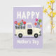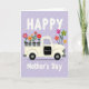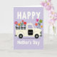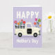 This card features a creamy off-white pickup truck centered on a light lavender background, with a gentle repeating pattern that adds soft texture. The truck bed is packed with potted flowers in fuchsia, orange, and deep red, with leafy green stems that lean together like a shared bouquet ❤️. A few oversized blooms in magenta, green, and sunny yellow rise from the front of the truck, giving the scene a sweet, daydream-like twist. The word “HAPPY” appears in white at the top, while “Mother’s Day” sits in white along the bottom, framing the illustration. A small line of text on the truck’s side hints at flowers and gifts, like a quiet note meant for someone special 👩. A faint shadow beneath the tires anchors the truck and keeps the flat colors from feeling too floaty. The petals are drawn in solid, unshaded shapes, and the lavender background stays light behind the bright blossoms.