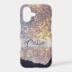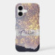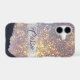 This pretty phone case for her features a violet lavender blue ragged edge swatch overlay that has a multitude of tiny gold star shines. Behind the image is a dark purple violet background. A silver paint strip holds your custom text, also in purple gray violet. Unique and eye-catching!