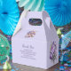 This design starts with a soft lavender background. On the front there’s an image of wedding bands and flowers. Below that is an area where you can leave a personal message to your guests. The back design has the wedding bands and flowers. It also has two champagne glasses and an area for names and the date. This favor box is good for showers, engagement parties and weddings.