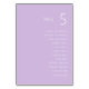 This table number is designed to be modern and sleek, with a practical simplicity. Its minimalist design includes a place to write each of your guest's names in a way that is clear and easy for them to read. Its beautiful soft purple colour will suit any lavender-themed, or pastel-toned wedding. As an example for the back of the table number card, you can choose to keep the exact wording as the front, or delete the back wording and decide to include a photo of yourselves or your names and wedding date.