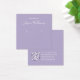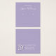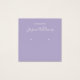 A simple lavender earring display card: just white text on lavender (light purple) background, with the earring places indicated by two very small circles. The name is written in an elegant script.