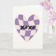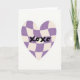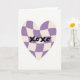 This card shows a large heart centered on a plain white background, so your eyes go straight to it. The heart is filled with a wavy checkerboard pattern in soft lavender-purple and creamy off-white. The curved checks make the heart feel gentle and lively, like it’s softly moving. Across the middle of the heart, the text “xoxo” appears in black, written in a loose, brush-like letter style. The letters sit right over the pattern and stand out clearly against the lighter colors. If you look closely, the colored sections have a faint fabric-like texture that adds a cozy touch. It feels meaningful to give because it keeps the message simple—hugs and kisses—while still looking thoughtful and sweet 🥰❤️.