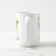 BOGO! On one side of the mug is a pretty watercolor of lavender and blue wisteria with busy yellow bees. On the other side is a cluster of yellow plumeria or frangipani blossoms accented by a blue butterfly. An orange butterfly happily sits in the center between the two flowers.