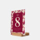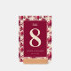 This is a vintage style image featuring an elegant table number card for wedding decor. The central maroon panel showcases the large, stylish number "8" in cream, surrounded by delicate white script that reads "table." Below, the names "Lauren & Benjamin" are elegantly inscribed with their special date, "May 23, 2026," adding a personal touch. The background bursts with rich red roses and birds on a creamy backdrop, creating a romantic and sophisticated ambiance perfect for a memorable celebration.