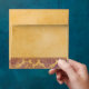 A playful fusion of contemporary sensibility with vintage, old fashioned motifs, convincingly united by a grunge aesthetic. A beautifully intricate floral damask border wraps around the bottom of the envelope, against a softly textured, cream paper background. The inner lining features an amorphous, shifting, watercolor-inspired grunge in tones of lilac and deep purple. This design is sure to make a bold statement.