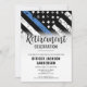 This design features a police force flag with black and white stripes, and a thin blue line stripe as well. "Retirement Celebration" sits above all of the party details for the retiring law enforcement officer, sheriff, captain, or chiefs retirement celebration.