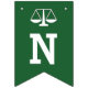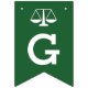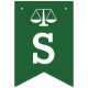 Lawyer or law school grad congratulations decor featuring scales of justice on green background.