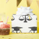 Creative law school graduation gift wrap for lawyer grad featuring classic black cap with gold tassel and scales of justice pattern.