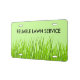 Lawn mowing service license plate design including green grass lawn graphic image, text you can personalize and a green background color you can customize. Designed for business in the lawn, landscaping, or grounds maintenance businesses. Use as a mobile advertisement to promote your business on the road.