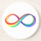 Bright symbol of infinity from plastic layers of red, yellow, green, turquoise, blue and purple saturated colors on white background.