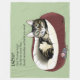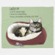A tabby cat laying in his burgundy coloured cat bed defending his laziness.