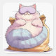 Pure nap goals! This plump, fluffy cartoon cat is curled up in total comfort on a giant bag of crisps, perfectly capturing lazy-day energy. With pastel shades of pale pink, baby blue, and a shiny purple sleep mask pushed up on its forehead, this sleepy feline oozes smug satisfaction. The soft curves, bold lines, and gentle textures create a sticker-style illustration that’s both cozy and comical. Set against a clean white background for contrast, this design is a must-have for cat lovers and snack enthusiasts alike.