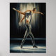 A breathtaking Art Deco oil painting depicting a male and female figure skating duo in shimmering silver costumes, their intertwined, stylized geometric forms frozen at the apex of a dramatic lift and sculpted by theatrical chiaroscuro lighting.