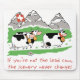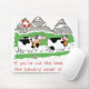 "If you're not the lead cow, the scenery never changes" Humorous cartoon cows parade through green pastures with edelweiss at the base of the Alps