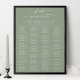 Simple Elegant Leaf Green Alphabetical Wedding Seating Chart sign, with alphabetical seating arrangement - in beautiful handwriting script and your personalized text. A stylish yet simple formal design in any background color you choose. Just click the edit using design tool link, shown under the text personalization area on the right, and choose your custom color background. This sign poster template makes it fast and easy to create stunning additions to your wedding decor. Signs can be enlarged, there are many sizes to choose from, as well as options for custom framing and matting. Welcome custom signage.