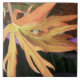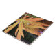 The artwork on this 6” Ceramic Tile is an original closeup photograph by HomeWare of a leaf on a young coral plant. The plants have palmate leaves whose leaflets have notched edges. After a shift in color, the leaf looks reddish gold. The flower pots have become purple, all against a dark brown and green background.