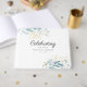 Elegant, green-blue-gold, leafy "Celebration of life" white Guest Book. Elegant, lovely handwriting font.
