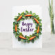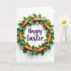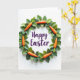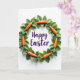 This card shows a circular wreath of deep green leaves on a white background, with several long orange carrots tucked evenly around the ring and their small green tops pointing outward 🌷. The leafy edges look slightly jagged and textured, like fresh garden greens laid out with care. Inside the open center, the words “Happy Easter” sit prominently in rich purple lettering, centered so the message feels like it’s being offered straight to the reader. The purple text contrasts strongly against the white space, while the green and orange border wraps around it like a gentle embrace, suggesting a friendly closeness. The arrangement is balanced and tidy, with the carrots spaced in a way that feels like two friends coordinating a spring table setting 🐰. Bright, even lighting keeps every color clear, and faint shadows under the leaves and carrots add a little depth without making the scene look heavy. The wreath forms a neat circle, with the carrots acting like small spokes around the edge and the purple greeting sitting calmly in the middle.