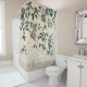 This beautiful biophilic shower curtain art in soft colors features leafy branches hanging over a neutral background.