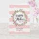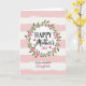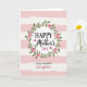 This card features soft horizontal pink and white stripes in the background, with a lightly brushed texture that feels gentle and cozy. Centered on the front is a round wreath made of green leafy vines dotted with small five-petaled pink flowers, like a floral hug around the message. Inside the wreath, “HAPPY” at the top and “DAY” at the bottom appear in black, easy-to-read lettering, while “Mother’s” sits in the middle in a flowing black cursive style that adds a tender, affectionate touch ❤️. Two small red hearts rest near the central word, like quiet little notes of love between close family members. Beneath the main line, the phrase “to my wonderful Daughter” is placed in smaller text, with “Daughter” in soft pink cursive that matches the blossoms 🌼. The layout feels balanced and intimate, with the wreath guiding your eyes toward the words and then down to the dedication. The green ring and pink flowers frame the lettering neatly, with the red hearts standing out as tiny accents against the pale striped background.