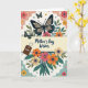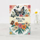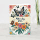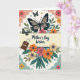 Designed with a soft spring palette, this Mother’s Day card features an ivory background framed by scalloped borders in gentle peach and calm teal. A wide creamy-yellow band runs horizontally across the center, carrying the words “Mother’s Day Wishes” in flowing dark lettering. Above the band, a large stylized butterfly with deep indigo and cream wings hovers like a quiet guardian, while smaller green-winged butterflies drift nearby among slim green leaves and coral-orange blossoms 🌼. Below the message, a clustered bouquet of simplified flowers in coral, sunny yellow, and warm orange rises with teal foliage, giving the scene a cozy, affectionate feel ❤️. To the left of the main wording, a small rich-brown tag hangs from a heart-shaped loop and reads “AUNT” in crisp white text, like a little note tucked into the design. Tiny scattered floral accents dot the open spaces, adding gentle texture without crowding the layout. The upper butterfly’s indigo wings show cream sections near the edges, with small green butterflies floating beside it over the leafy sprigs.