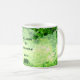 This lovely leafy wedding mug invites you to enter a world of peace and serenity. Maple leaves frame the image, leading to a woodland scene in yellow, white and forest green. Customize text for your special occasion.