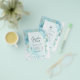 Pretty sea glass aqua blue teal colored flowers with gold leaves feature on this modern elegant wedding invitation.
