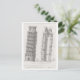 This postcard is a reproduction of a vintage architectural drawing/diagram of the Leaning Tower of Pisa in Italy.