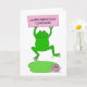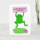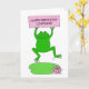 A cute cartoon frog jumping up, holding a pastel pink sign hat says 'Happy Birthday Leapling'.