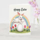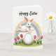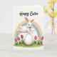 The front design shows a white bunny with long ears and a fluffy tail leaping high in the air, its wide eyes and open smile aimed toward the viewer like it’s sharing a happy moment with a close friend 🐰. Just beneath it sits an oversized white egg, giving the scene a gentle focal point and a sense of closeness between the character and its springtime surprise. A pastel rainbow arcs across the top background in soft red, yellow, green, and blue, creating a calm sky-like setting. Along the bottom edge, a band of green grass is dotted with tulips in purple, red, pink, and yellow, adding bright spots of color among the softer tones 🌷. Near the top, the words “Happy Easter” appear in a flowing, hand-drawn style, set in a dark tone that stands out against the light background. The lighting stays airy and bright, and the bunny’s outstretched paws and lifted posture suggest a cheerful, affectionate energy, like a friendly greeting in motion. The rainbow curves above the text while the tulips cluster in the foreground beneath the egg.