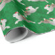 Leaping Hare Christmas Wrapping Paper features a leaping hare (rabbit) in a red Santa hat on a vibrant green background hand painted in watercolor on textured paper.