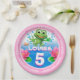 Leaping Hot Frog paper party plate 9 inch. One of my favorite illustrations. This little leaping frog loves birthdays and parties so much that she's jumping right out of the picture. Perfect for any kid's party ware, you'll find her on cards, invites and plates and various kids apparel. All with customizable ages and names for the perfect tailored party.